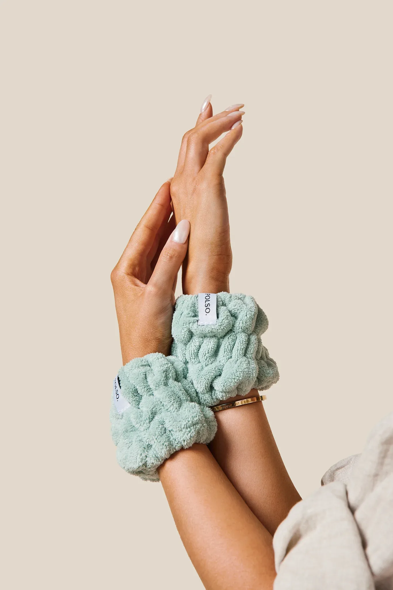 That’s not the only solution POLSO has spearheaded. The brand also released a matching spa headband so you can keep your hair dry and out of your face when doing your skincare regimen. You can get a set of the wash cuffs and the headband as a bundle in white or sage green.