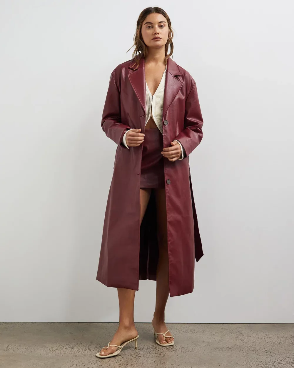 A classic trench coat might not exactly give you the glamorous ‘night out’ vibes you were looking for. However, this Lover Mai Trench Coat in a maroon leather does.
