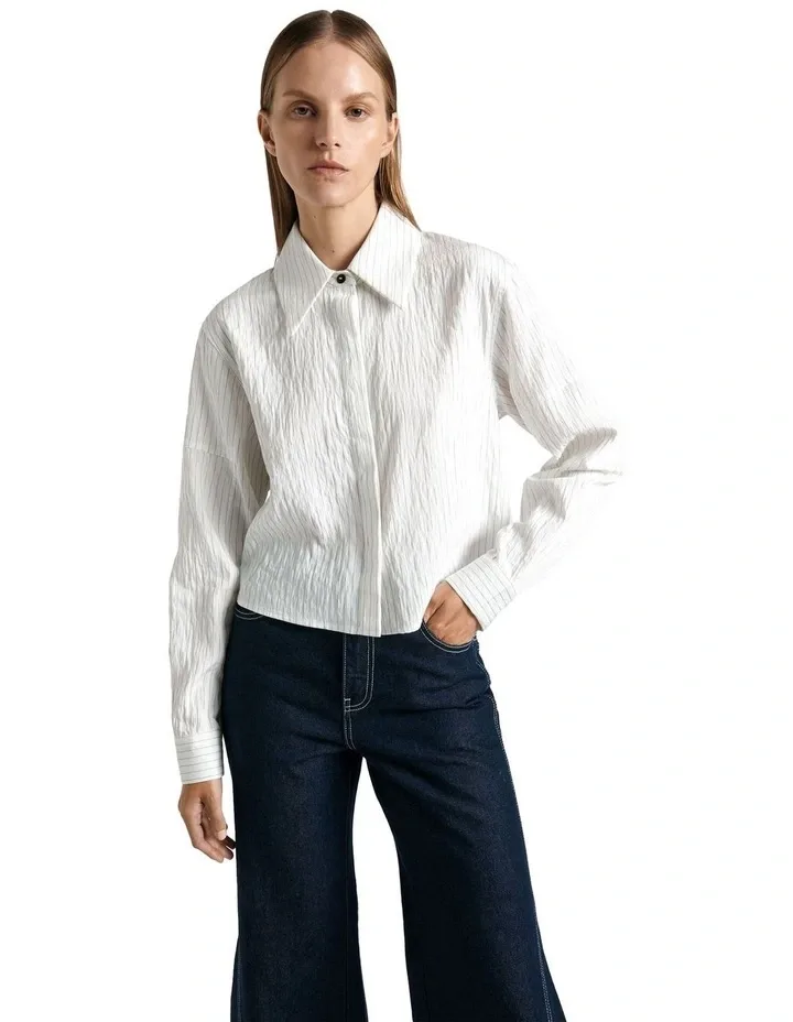 White shirts don’t have to be boring. This one from Cue puts a super chic retro twist on the classic white blouse. Swapping out a regular short collar, this shirt instead features a vintage-inspired dog-eared collar. It has a crimped fabric design, which means you don’t need to worry about ironing (win!). Plus, it’s cropped and with a pinstripe design that mixes business with leisure.