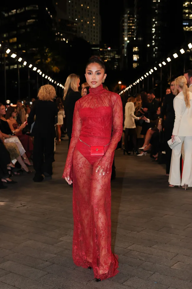 Media personality and Golden Bachelor host, Sam Armytage, looked fabulous in this red lace number at the Carla Zampatti opening show.