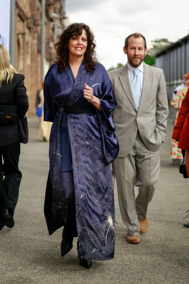 The British-American actress, Ione Skye, looked wistful in this silky navy Kimono-style maxi dress, alongside her husband, Australian musician and actor Ben Lee in a beige suit.
