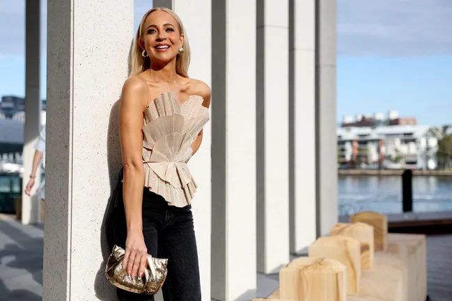 Australiann media personality, Carrie Bickmore, brought some golden glow to the Aje show during Australian Fashion Week. We love this take on a corset top, paired with black pants and a golden clutch.