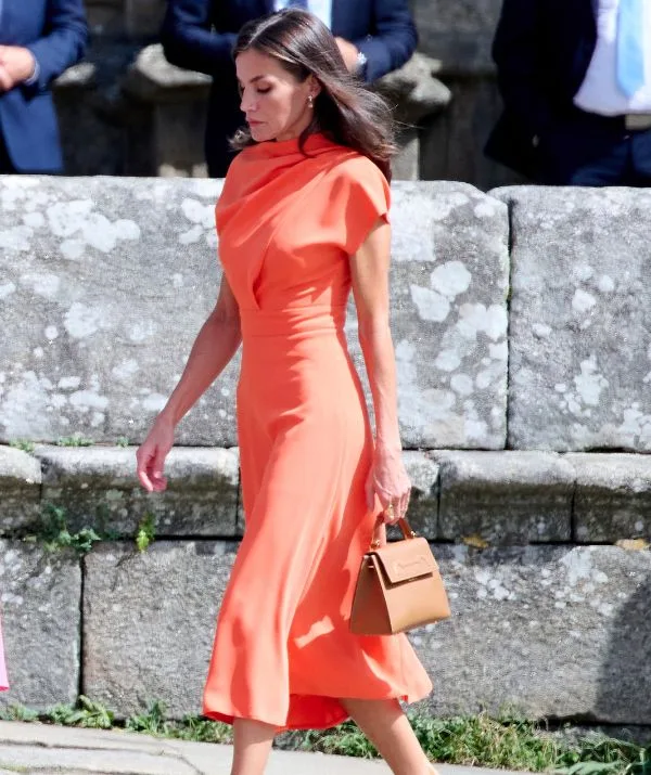 Queen Letizia rocked a bold orange colour rarely worn by the royals while visiting the Cathedral of Santiago in July 2022.