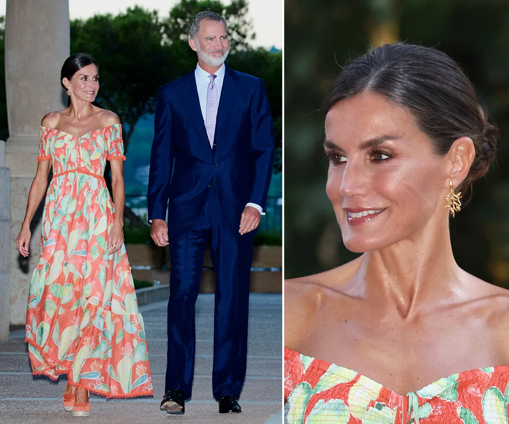 Letizia bared her shoulders in this $645 summer maxi from Charo Ruiz Ibiza, pairing it with bright orange espadrilles and a set of stunning gold earrings worth almost $300 by Isabel Guarch.