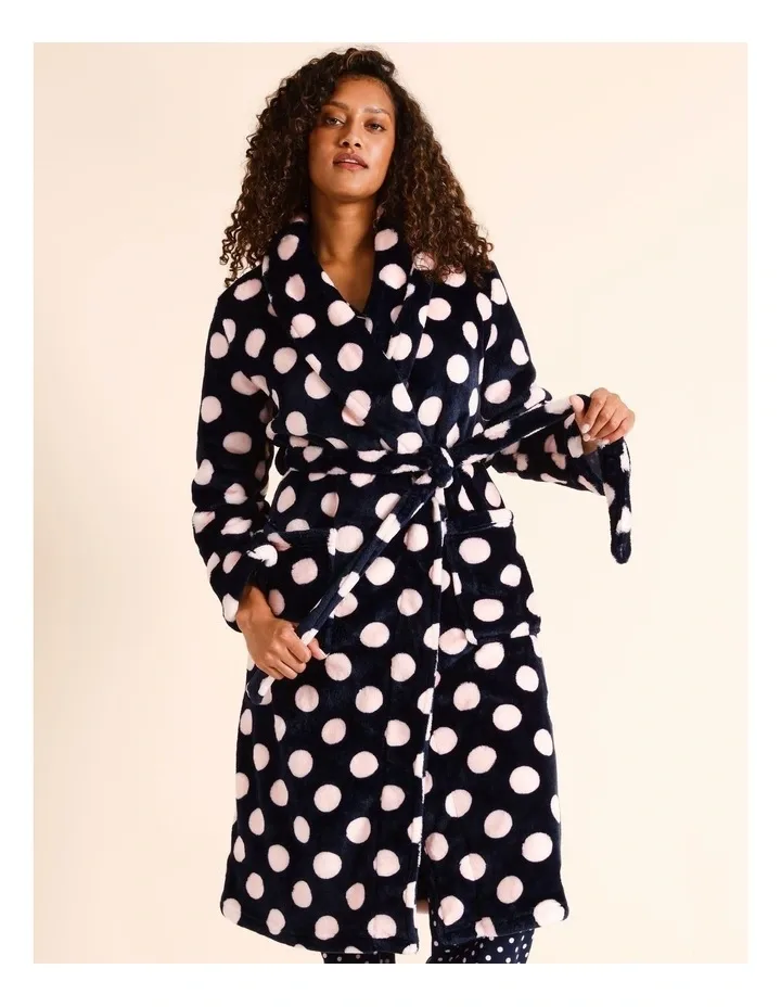- Soho Fleece Long Robe in Navy Spot, $69.95, Myer