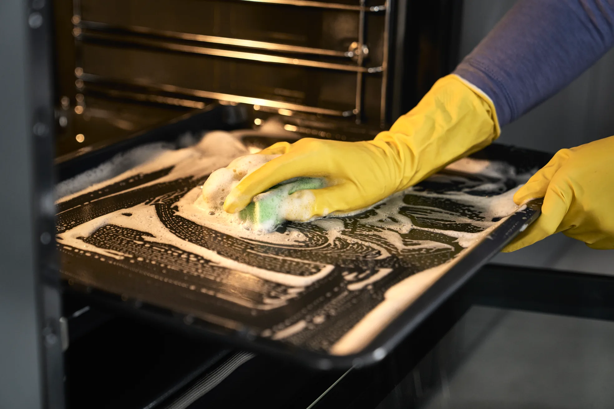 If your oven doesn’t have a nifty self-cleaning feature, then you’ll be disinfecting your oven by hand either with a store-bought or homemade cleaning solution. Here’s a step-by-step guide on how to properly clean the oven.