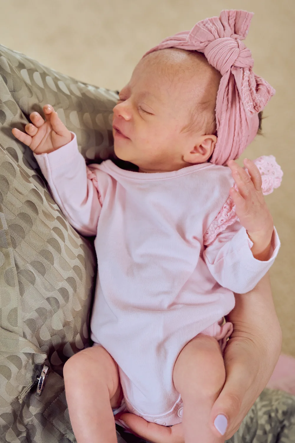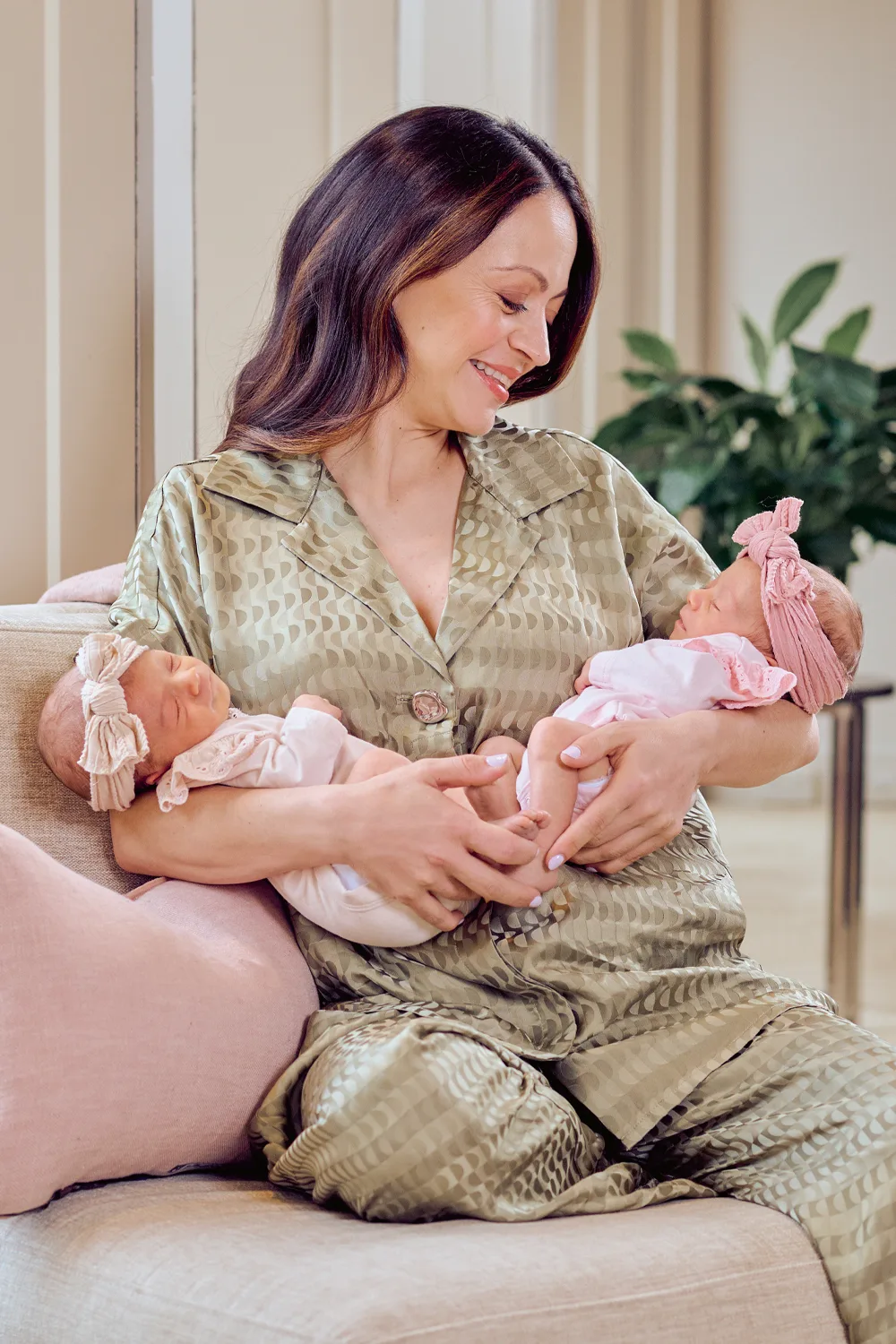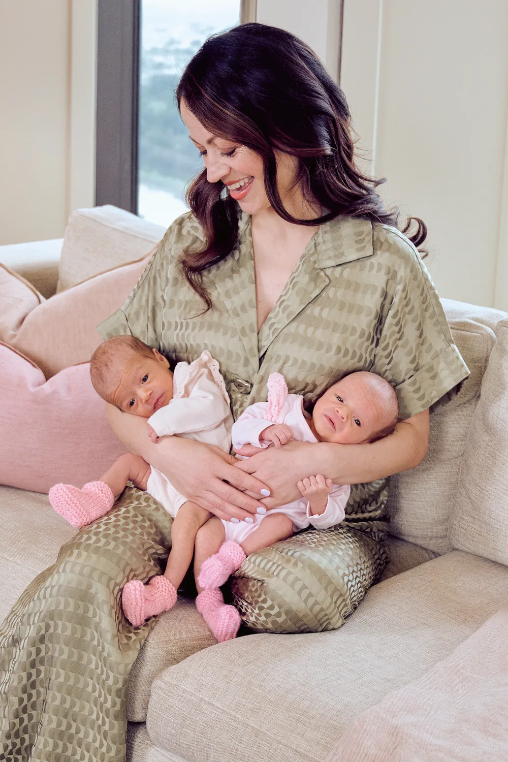 As she cradles her month-old girls, one in each arm, it’s clear she’s over the moon, albeit still in slight disbelief at her good fortune. “I just feel so lucky,” she enthuses, her eyes bright despite the shadows beneath telling of an underlying sense of exhaustion.