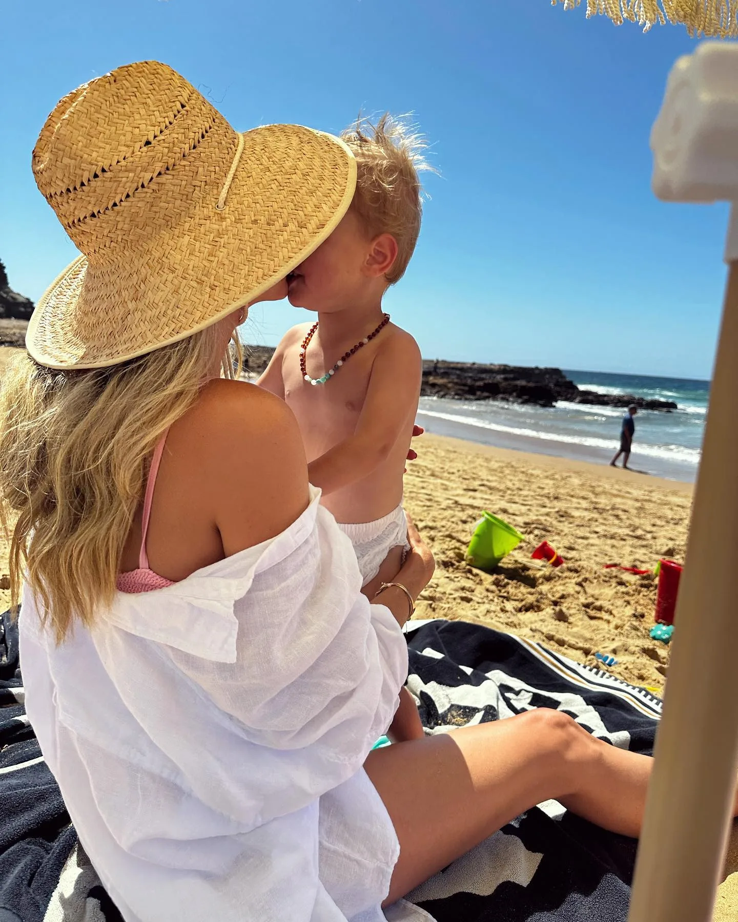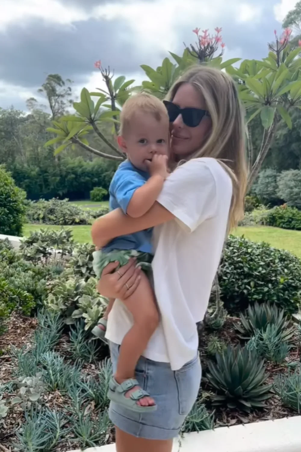 In August 2022, Jen treated fans to a slew of photos that proved she’s got the mum-of-two juggle down to an art with Hendrix in the harness and Frankie holding tight to her mum’s hand on a beach walk.