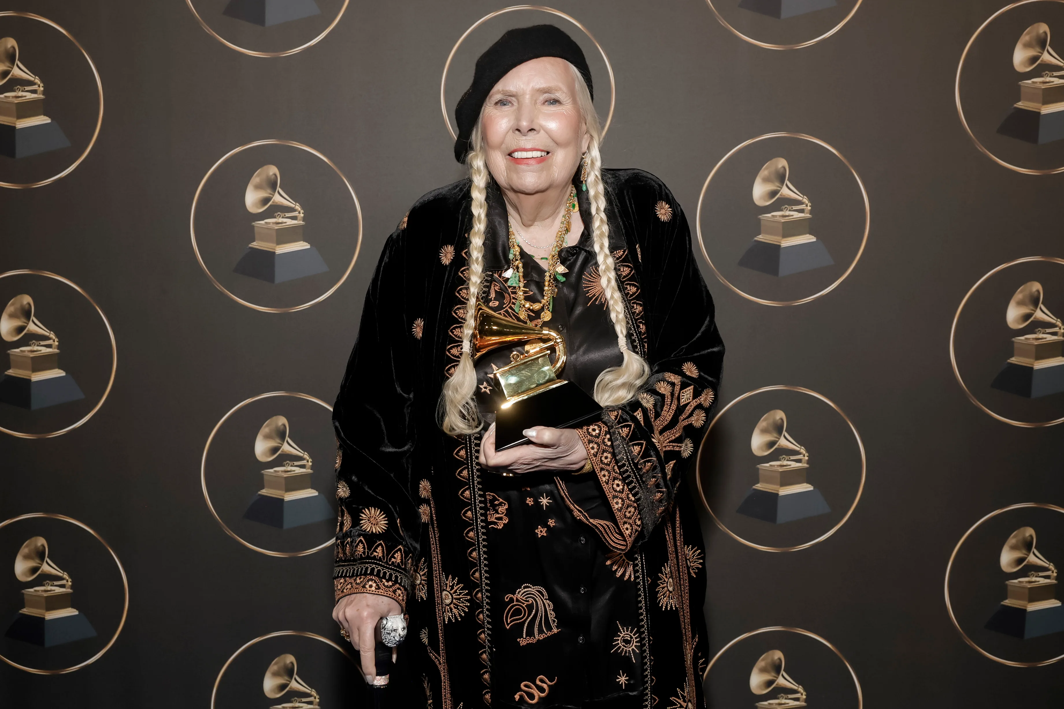 Joni Mitchell wore a stunning three-piece embroidered set to the Grammys this year. The 80-year-old accessorised her outfit with a black beret and the Grammy she won for Best Folk Album during this year’s pre-telecast Premiere Ceremony.
