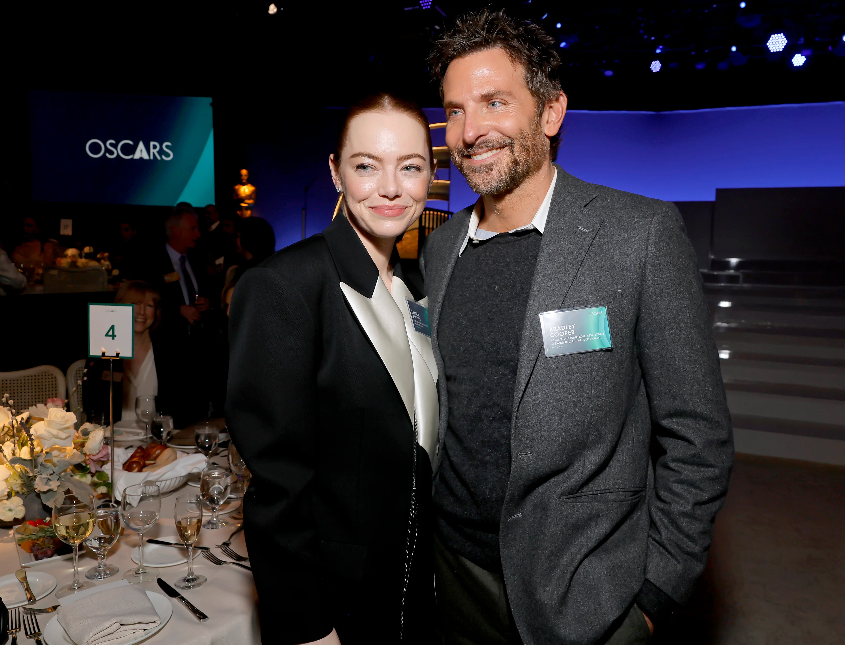 Emma Stone and Bradley Cooper reunited at the Oscars Nominees Luncheon; we love Emma’s black and white Louis Vuitton suit and Bradley’s matching sweater and jacket.