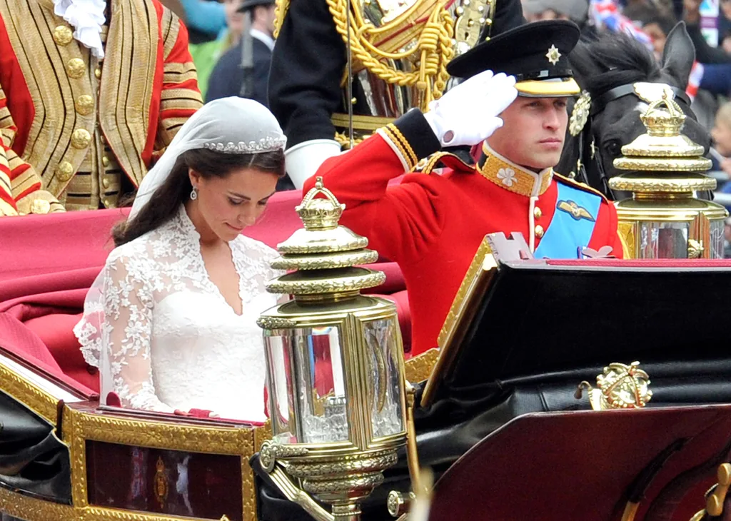 The newly minted Duke and Duchess of Cambridge rode through London by carriage after the Westminster Abbey service, but as a mark of respect Catherine would bow her head every time William would salute.